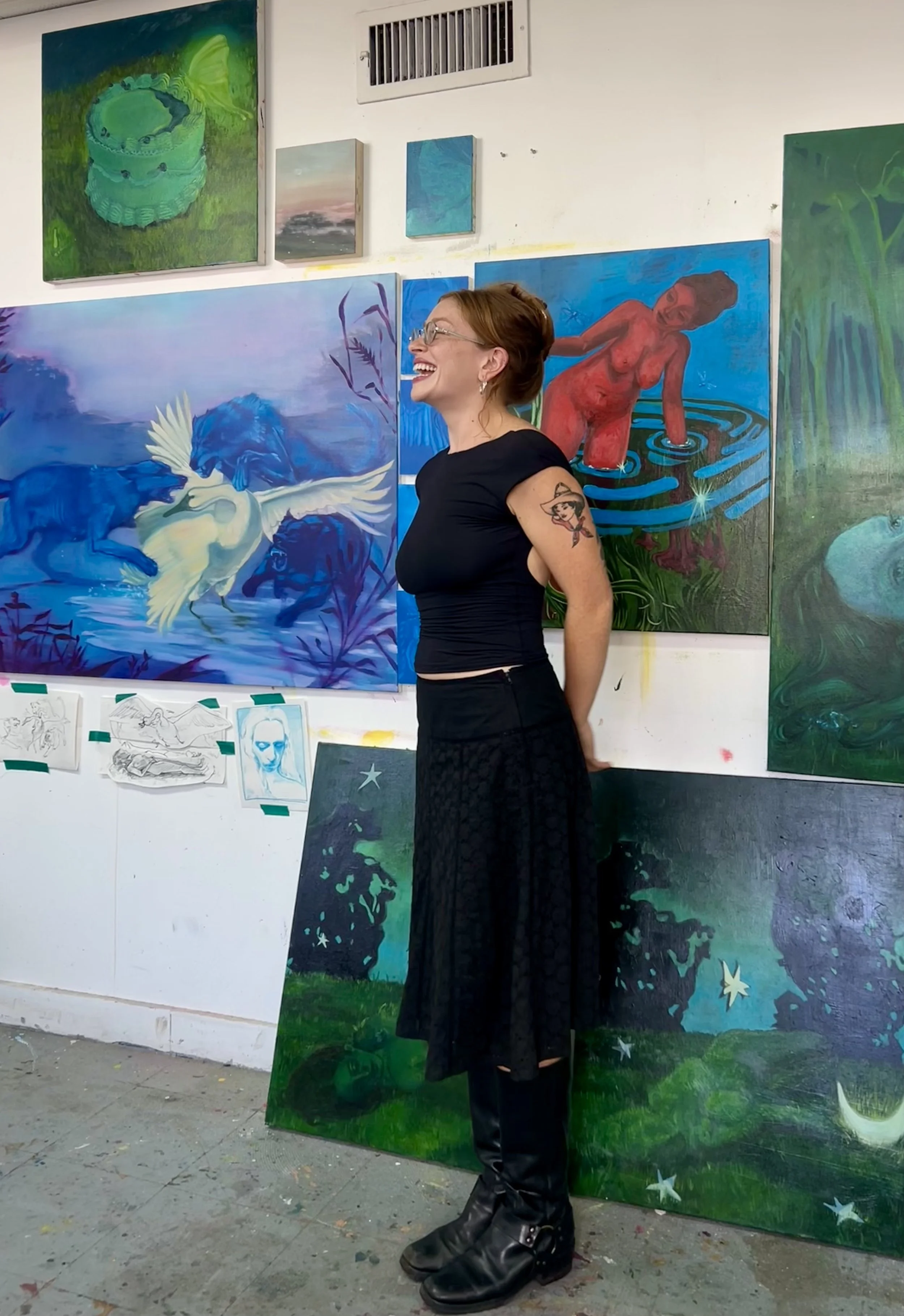 Frances Matassa (b. 1994, Seattle) is a New York-based figurative painter whose work explores themes of dissociation, grounding, and transformation. Her dreamlike compositions depict figures navigating transitional landscapes where reality blurs into the surreal. Using a vivid, often unnatural palette, Matassa heightens emotional resonance while evoking unease and disorientation. In her current series, figures emerge from dissociation to reconnect with the tactile world—lying in long grass, wading through murky waters, or glowing softly against twilight. Recurring motifs like glowing moths and symbolic insects mirror the figures’ inner worlds, embodying transformation, decay, and memory.