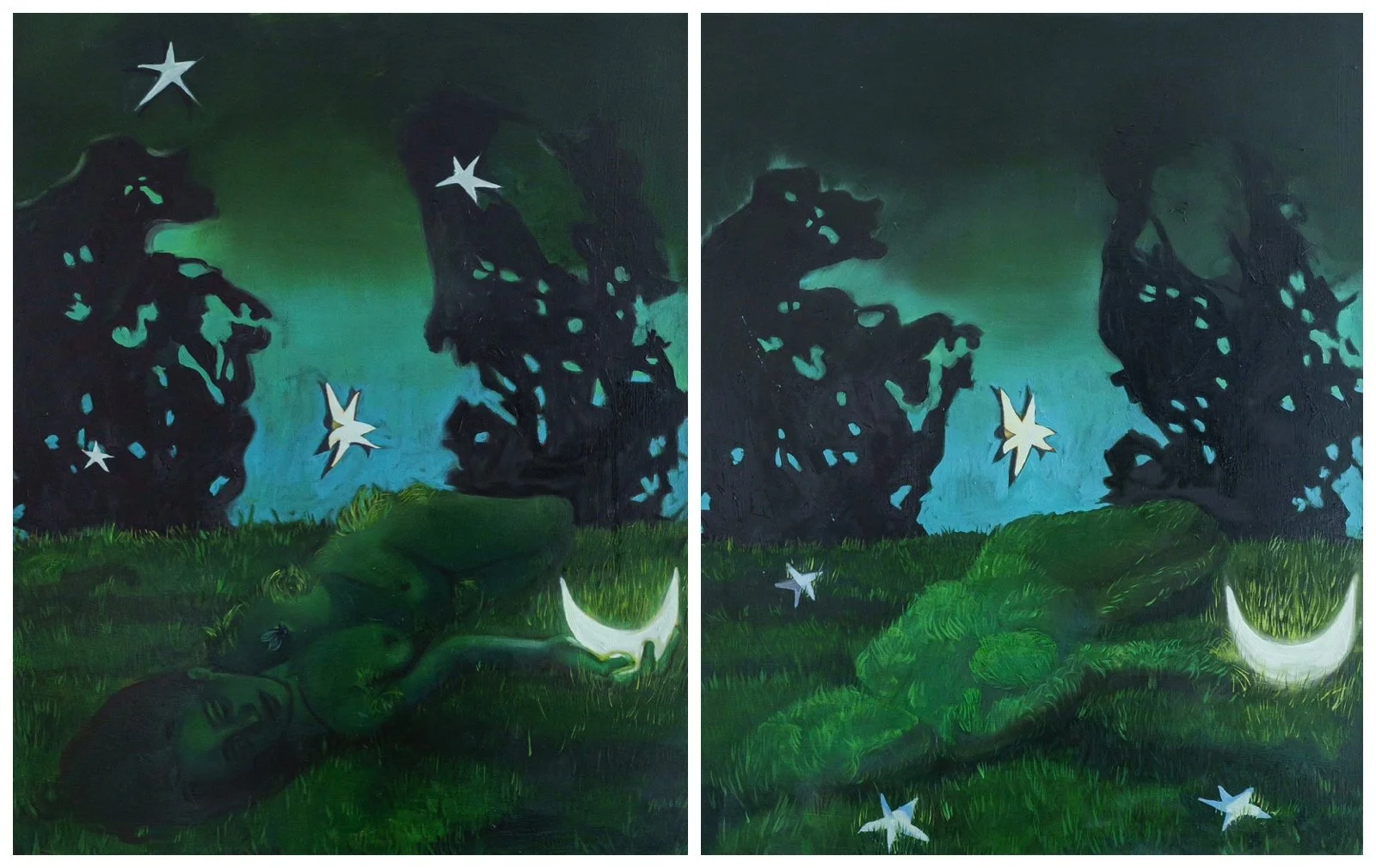 The paper moon begins to fall, and the architecture of these dreamscapes transforms, becoming rooted in the earth. Figures lay in the long grass, wade through the murky waters, and inhabit spaces rich with sensory experiences that anchor them to reality. The tickle of grass against skin, the sting of a bee, the rustle of critters and crickets in the woods, and the flickering glow of fireflies at dusk all serve as reminders of the physical body and its connection to the world.